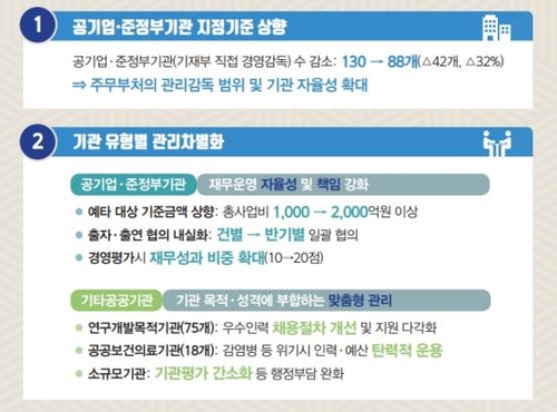 이를 위해 정부는 15년째 유지해온 '정원 50명, 총수입액 30억원, 자산규모 10억원 이상'인 공기업·준정부기관 분류 기준을 '정원 300명, 총수입액 200억원, 자산규모 30억원 이상'으로 완화할 계획이다.