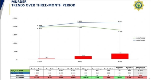 (요하네스버그=연합뉴스) 김성진 특파원 = 남아프리카공화국에서 올해 4∼6월 피살자는 6천424명으로 1년 전 같은 기간보다 11.5% 증가했다고 경찰 당국이 19일(현지시간) 밝혔다.