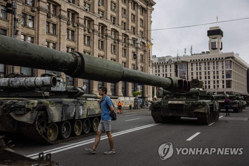 24일 우크라이나 독립기념일을 앞두고 우크라이나군이 전장에서 노획한 러시아 탱크를 진열해 놓은 것입니다.