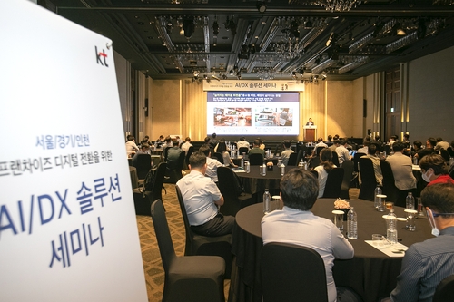 ▲ KT[030200]는 30일 오후 서울 서초구 엘타워에서 수도권 기업 고객을 위한 프랜차이즈 및 물류 산업 디지털 전환(DX) 세미나를 열었다고 31일 밝혔다. KT 강남서부광역본부 주최로 '매장 효율화' '디지털 물류' 세션으로 나뉘어 열린 세미나에는 관련 업계 종사자 230여 명이 참석했다. 스마트캐스트의 스마트 오더 솔루션인 '오더잇', 더난의 로봇연동 호출 솔루션 '벨룩스', 더나인컴퍼니 코리아의 키오스크 솔루션인 '오더나인' 시연·체험 행사도 진행됐다. (서울=연합뉴스)