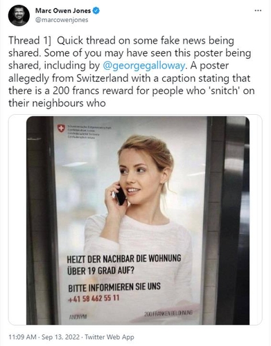 15일(현지시간) 스위스 연방 경찰청(Fedpol)에 따르면 집안 온도가 19도를 넘게 난방을 하는 이웃을 신고하도록 스위스 연방정부가 장려하고 있다는 포스터가 최근 온라인 공간에 유포됐다.