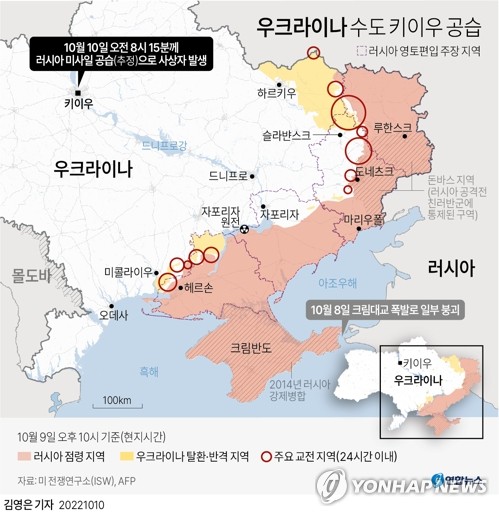 키이우가 공격을 받은 것은 지난 8일 러시아가 병합한 크림반도와 러시아 본토를 잇는 크림대교가 폭발로 일부 붕괴한 지 이틀 만이다.