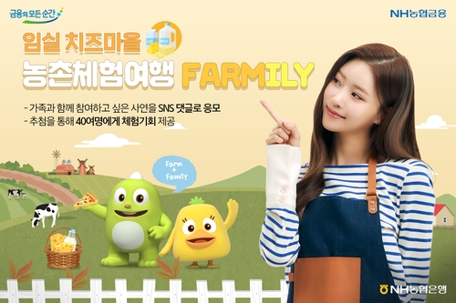 ▲ NH농협은행은 '농촌체험여행 Farmily(Farm+Family)' 소셜네트워크서비스(SNS) 4차 이벤트를 오는 25일까지 실시한다고 19일 밝혔다. 가족과 함께 참여하고 싶은 사연을 댓글로 작성하면 추첨을 통해 40여명에게 기회를 제공한다. 당첨자들은 오는 11월 12일 임실 치즈마을(치즈온)에서 치즈와 미니 치즈크러스트 피자 만들기, 패브릭 에코백 꾸미기 체험 등 다양한 체험을 즐길 수 있다. (서울=연합뉴스)