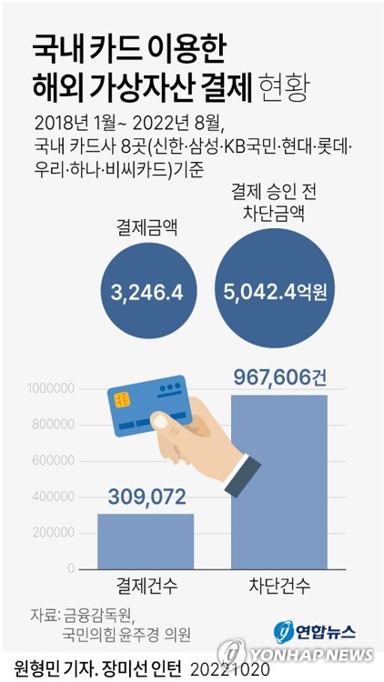 (서울=연합뉴스) 심재훈 이지헌 오주현 기자 = 가상자산 투기, 자금세탁 등을 방지하기 위해 2018년 1월부터 국내 카드사들이 카드를 이용한 가상자산 구매를 차단했음에도 4년여간 해외 가상자산거래소에서 3천200억원이 넘는 결제가 이뤄진 것으로 나타났다.