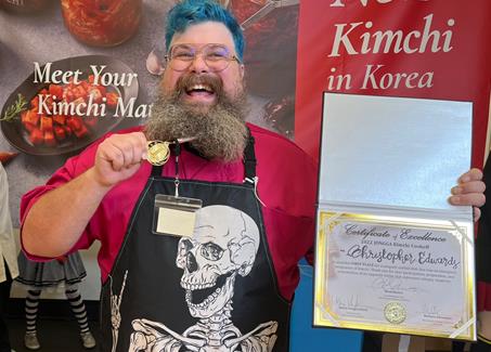 100㎏은 족히 넘어 보이는 거구에 덥수룩한 턱수염, 머리는 파란색으로 물들인 크리스토퍼 에드워즈(38) 씨는 30일(현지시간) 미국 캘리포니아주 나파에서 열린 요리경연대회 '김치 쿡오프'에서 우승을 차지한 뒤 함박웃음을 지었다.