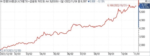 3년 만기 카드채(신용등급 AA·민평 3사 평균) 금리는 지난 4일 기준 6.1%로, 작년 말 2.4% 대비 3.7%포인트 급등했다.