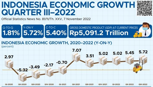 7일 인도네시아 통계청(BPS)에 따르면 지난 3분기 인도네시아 국내총생산(GDP)은 1년 전보다 5.72% 늘었다.
