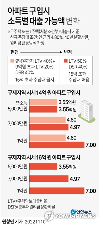 (서울=연합뉴스) 신호경 기자 = 다음 달부터 무주택자 등의 주택담보대출비율(LTV)이 50%로 높아지고 투기·투기과열지구 내 15억원 초과 아파트의 주탁담보대출까지 허용되면, 연 소득에 따라 대출 가능 금액이 지금보다 많게는 수억 원씩 늘어난다.