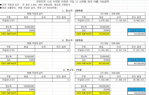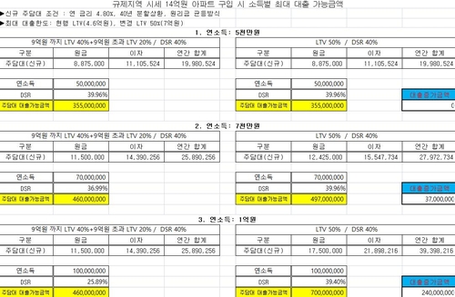 현재 규정대로 LTV를 9억원까지는 50%, 9억원 초과분에 20%를 적용하고 '총부채원리금상환비율(DSR) 40% 초과 금지' 규제도 더한 결과다. 신규 주택담보대출의 조건은 연 금리 4.80%, 40년 분할 상환, 원리금 균등 방식을 가정했다.