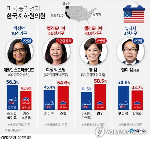 영 김 의원이 이날 당선됨에 따라 이번 중간선거에 출마한 한국계 현역 하원의원 4명 중 3명이 연임을 확정했다.