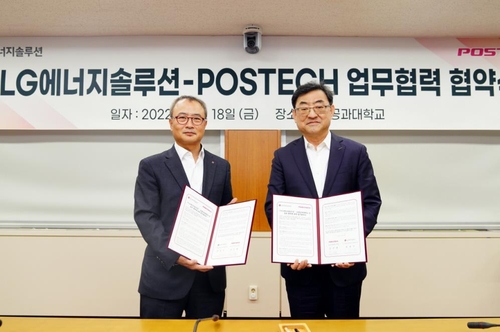 (서울=연합뉴스) 김기훈 기자 = LG에너지솔루션[373220]과 포항공대(POSTECH)가 18일 업무협약을 맺고 배터리 소재 및 공정 기술 개발을 위한 산학 공동협력체계를 마련하기로 했다.