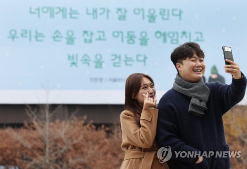 (서울=연합뉴스) 심재훈 기자 = 교보생명은 올겨울 광화문 글판으로 '손을 잡고 빛속을 걷는다'라는 문구를 내걸었다고 28일 밝혔다.