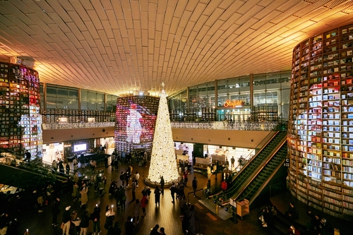 스타필드 코엑스몰은 별마당 도서관에 11m 규모의 골드 트리와 조명을 활용한 미디어 콘텐츠인 '윈터 원더랜드'를 준비했다.