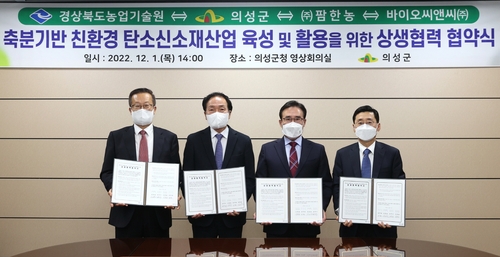 (서울=연합뉴스) 김아람 기자 = 팜한농은 경북 의성군, 경상북도농업기술원, 바이오씨앤씨와 축분 바이오차 상생협력 업무협약(MOU)을 체결했다고 2일 밝혔다.