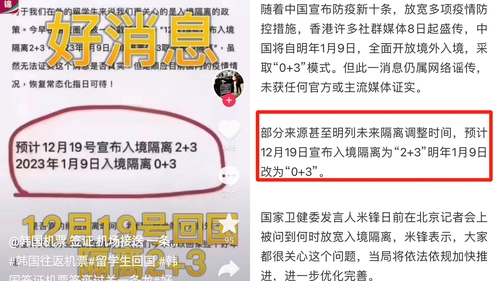 웨이보와 웨이신 단체 대화방에서는 최근 "오는 19일부터 입국자 격리를 '2+3(호텔 격리 2일, 자가 격리 3일)'으로 단축하고, 내년 1월 9일부터는 호텔 격리 없이 사흘간 자가 격리하는 것으로 완화될 것"이라는 글들이 잇따라 올라오고 있다.