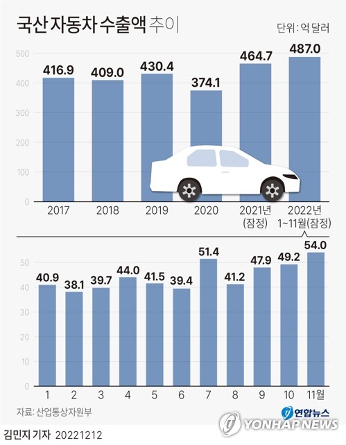 올해 연간 자동차 수출액은 사상 최초로 500억달러를 넘어설 것으로 예상된다.