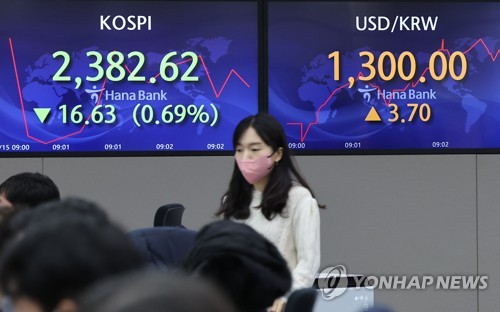 (서울=연합뉴스) 홍유담 기자 = 코스피가 15일 하락 출발해 2,380대로 뒷걸음질쳤다.