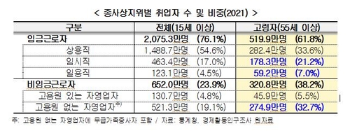 그러나 고령 취업자의 상용직 비중은 33.6%로 전체 취업자 중 상용직 비율(54.6%)보다 눈에 띄게 낮았다. 반면 임시·일용직 비중(28.2%)과 고용원 없는 자영업자 비중(32.7%)은 전체 취업자의 각 구성 비중을 웃돌아 고령자 일자리의 질이 상대적으로 낮은 것으로 분석됐다.