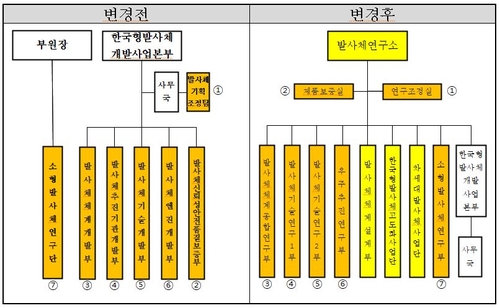 이에 따라 항우연은 이번 조직개편에서 발사체개발본부를 완전히 없애지는 않고 발사체연구소 산하에 다른 부서처럼 편제해 놓았다.