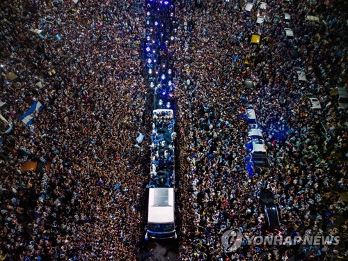 (서울=연합뉴스) 유현민 기자 = 36년 만에 월드컵 우승컵을 들고 금의환향한 아르헨티나 축구 대표팀이 몰려든 구름 인파에 예정된 카퍼레이드를 중단, 헬기를 갈아타고 행사를 마쳤다.