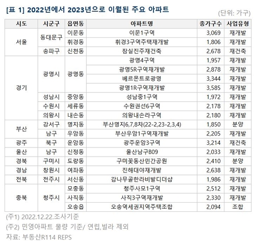 경기에서는 광명시 광명1R구역(3천585가구), 베르몬트로광명(3천344가구), 안양시 안양뉴타운맨션삼호(2천723가구) 등이 공급을 앞두고 있다.
