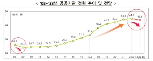2009년 이후 14년 만의 정원 감축이다. 이로써 공공기관 정원은 43만8천명으로 줄어들게 된다.