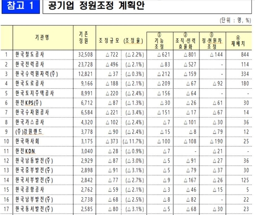 공공기관 중 정원 구조조정 규모가 가장 큰 기관은 철도공사(722명)다. 대한석탄공사는 정원 대비 감축률(21.2%)이 가장 높다.