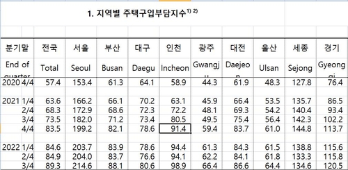 전국의 주택구입부담지수는 지난 2021년 4분기(83.5) 사상 처음으로 80을 돌파하면서 이전 최고치였던 2008년 2분기(76.2)를 뛰어넘었다.