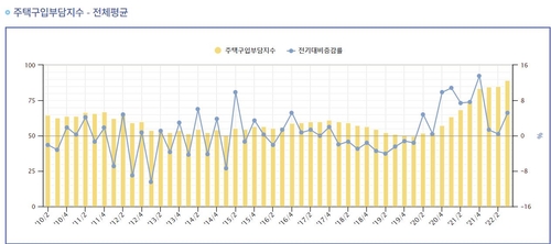 (서울=연합뉴스) 박대한 기자 = 지난해 하반기 이후 주택 가격이 하락하고 있지만 금리 상승으로 인해 대출상환부담을 나타내는 주택구입부담지수는 다시 사상 최고를 경신했다.