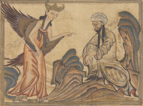 1318년에 사망한 페르시아 학자 라시드 알 딘이 저술한 '연대기'에 실린 이 삽화는 무함마드가 천사로부터 신의 계시를 받는 장면을 묘사했다.