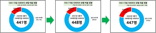 100대 기업 가운데 여성 사외이사를 둔 기업은 같은 기간 60곳에서 82곳으로 늘었다.