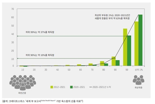 옥스팜 분석에 따르면 팬데믹 위기 속에서도 지난 2년간 전 세계에서 42조 달러의 새로운 부가 창출됐고 이 중 26조 달러(63%)가 세계 상위 1% 슈퍼리치에게 돌아갔다. 나머지 99%의 몫은 16조 달러에 불과했다.