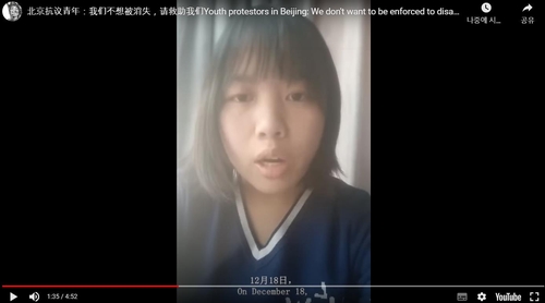 (베이징=연합뉴스) 조준형 특파원 = 지난해 11월 중국 베이징에서 벌어진 '백지시위'에 참가한 20대 여성이 체포되기 전 촬영한 것으로 보이는 영상이 최근 유튜브 등 인터넷 공간에서 반향을 일으키고 있다.