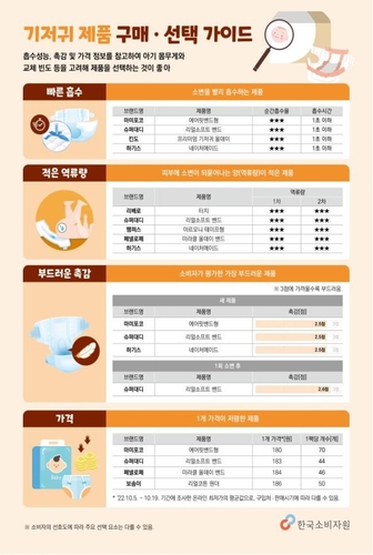 한국소비자원은 일회용 기저귀 10개 브랜드 제품의 품질, 안전성, 표시사항, 가격 등을 비교·평가한 결과 이같이 나타났다고 31일 밝혔다.