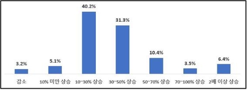 난방비 증가 수준은 10~30%가 40.2%로 가장 많고 이어 30~50%(31.3%), 50~70%(10.4%) 등 순이었다. 두 배 이상 늘었다는 응답도 6.4%에 달했다.