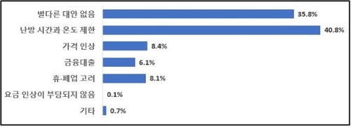 소상공인들의 대응책으로는 난방 시간과 온도 제한이 40.8%로 1위로 꼽혔고 별다른 대안이 없다는 응답이 35.8%에 달했다. 휴·폐업을 고려한다는 답변도 8.1%였다.