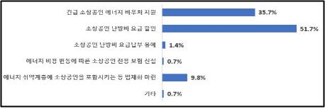 소상공인들이 가장 필요로 하는 난방비 관련 지원 정책으로는 소상공인 난방비 요금 할인(51.7%)이 절반을 넘었고 이어 긴급 소상공인 에너지 바우처 지원(35.7%), 에너지 취약계층에 소상공인을 포함하는 등 법제화 마련(9.8%) 등 순이었다.