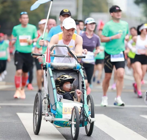 (베이징=연합뉴스) 한종구 특파원 = 중국에서 자폐증 아들에게 넓은 세상을 보여주겠다며 아들을 유모차에 태우고 마라톤을 하는 아버지가 있어 화제다.