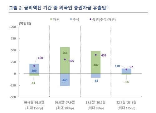 손 과장은 "최근 해외 공공기관 채권자금 순유출은 한미 간 금리 역전 외에 공공기관 투자 여력 약화, 신흥국 포트폴리오 조정, 차익거래 유인 축소, 원화강세·채권금리 하락에 따른 단기차익 실현 등 다른 요인이 영향을 미친 것으로 판단된다"고 밝혔다.
