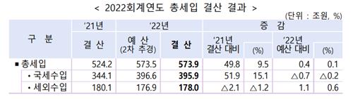 결산보고서에 따르면 지난해 총세입은 573조9천억원으로 전년도 결산 대비 49조8천억원 증가했다.