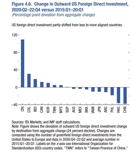 IMF는 미중 갈등으로 국가들이 공급망을 다시 자국으로 가져가는 '리쇼어링'과 믿을 수 있는 국가로 이전하는 '프렌드쇼어링'에 나서는 상황에 주목했다.