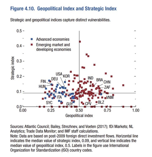 이는 다른 국가가 투자처로서 경쟁력이 있고 외교관계가 좋더라도 우선 자국에 투자하려고 한다는 것을 의미한다. IMF는 미국과 독일 등 다수 선진국도 전략산업에서는 상대적으로 취약하다고 평가했다.