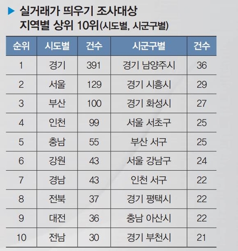 시군구별로는 경기 남양주시(36건)에 가장 많았고, 경기 시흥시(29건), 화성시(27건), 서울 서초구(25건), 부산 서구(25건), 서울 강남구(24건)가 뒤를 이었다.