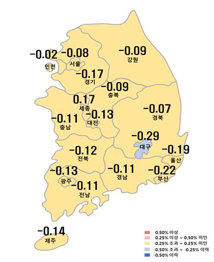 이번 주 경기도와 인천시 아파트는 지난주 대비 각각 0.08%, 0.02% 떨어져 지난주(-0.11%, -0.07%)보다 하락 폭이 줄었다.