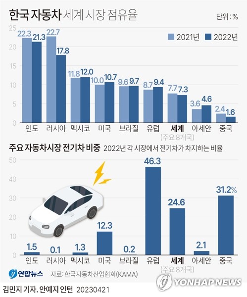 한국자동차산업협회(KAMA)가 21일 발표한 '2022년 해외 주요 자동차시장 및 정책동향' 보고서에 따르면 해외 8개 주요 시장에서의 한국차 점유율은 2021년 7.7%에서 작년 7.3%로 0.4%포인트 떨어졌다.