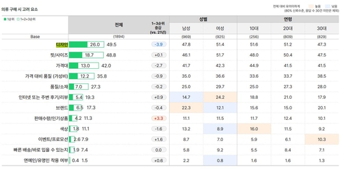 MZ세대가 의류 구매에 가장 중요시하는 가치는 디자인(49.5%), 핏·사이즈(48.8%), 가격대(42.0%), 가성비(35.8%), 품질·소재(27.3%), 리뷰(19.3%), 브랜드(17.3%) 등의 순이었다.