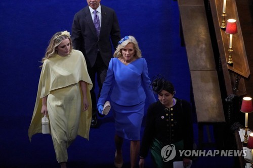 조 바이든 미국 대통령을 대신해 참석한 부인 질 바이든 여사는 푸른색 상하의 차림에 색깔을 맞춘 장갑을 끼고 나타났고, 동행한 손녀딸 피네건 양은 보색이 노란색 원피스 차림으로 곁에 섰다. 이는 우크라이나 국기 색상과 같다고 BBC 방송은 해석했다.