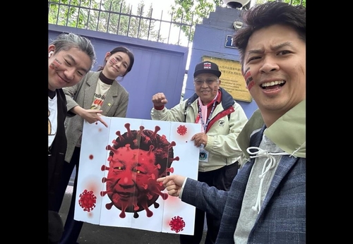 이들은 시진핑 중국 국가주석의 얼굴과 코로나19 바이러스 모습을 합성한 '시 바이러스' 사진을 펼쳐 들고 중국을 규탄하는 구호를 외쳤다.
