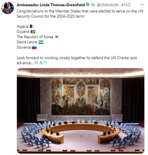 대신 토머스-그린필드 대사는 트위터를 통해 비상임이사국으로 선출된 한국 등 5개국을 거론하며 "유엔 헌장을 수호하고 국제 평화와 안보를 증진하기 위해 긴밀히 협력하기를 고대한다"고 말했다.