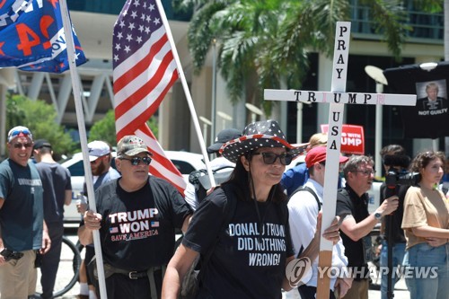 (워싱턴=연합뉴스) 김동현 특파원 = 국방 기밀을 불법으로 반출한 혐의로 연방 검찰에 기소된 도널드 트럼프 전 미국 대통령이 법원에 출석한 13일(현지시간) 미국사회는 또다시 분열된 양상을 적나라하게 드러냈다.